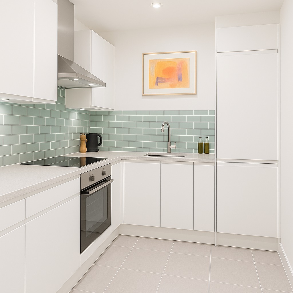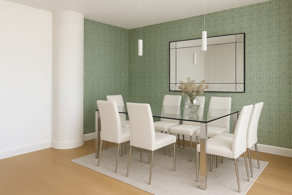 The kitchen features crisp white cabinetry and a sage green backsplash, blending classic style with contemporary minimalism. In the dining area, a patterned wallpaper adds depth and texture, complementing a striking glass table and upholstered chairs. Touches like the velvet ottoman in the hallway and curated artwork throughout reinforce a cohesive visual language that is both inviting and refined—a retreat in the heart of the city.