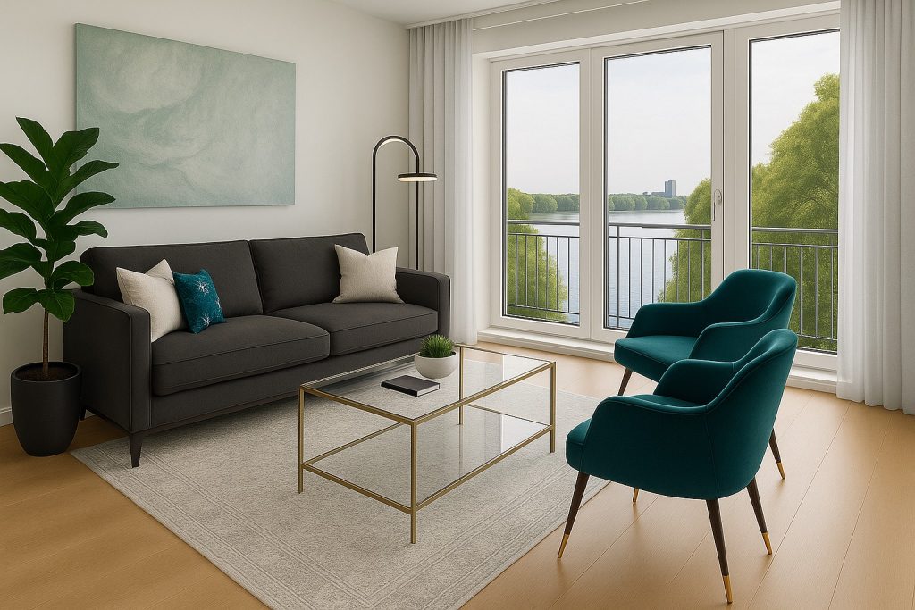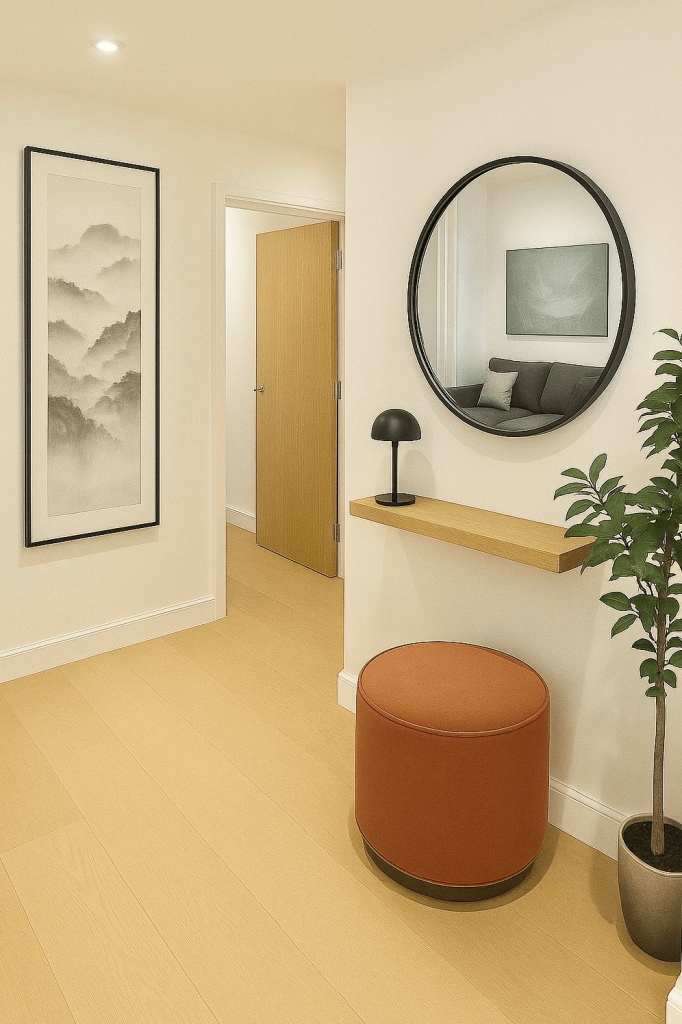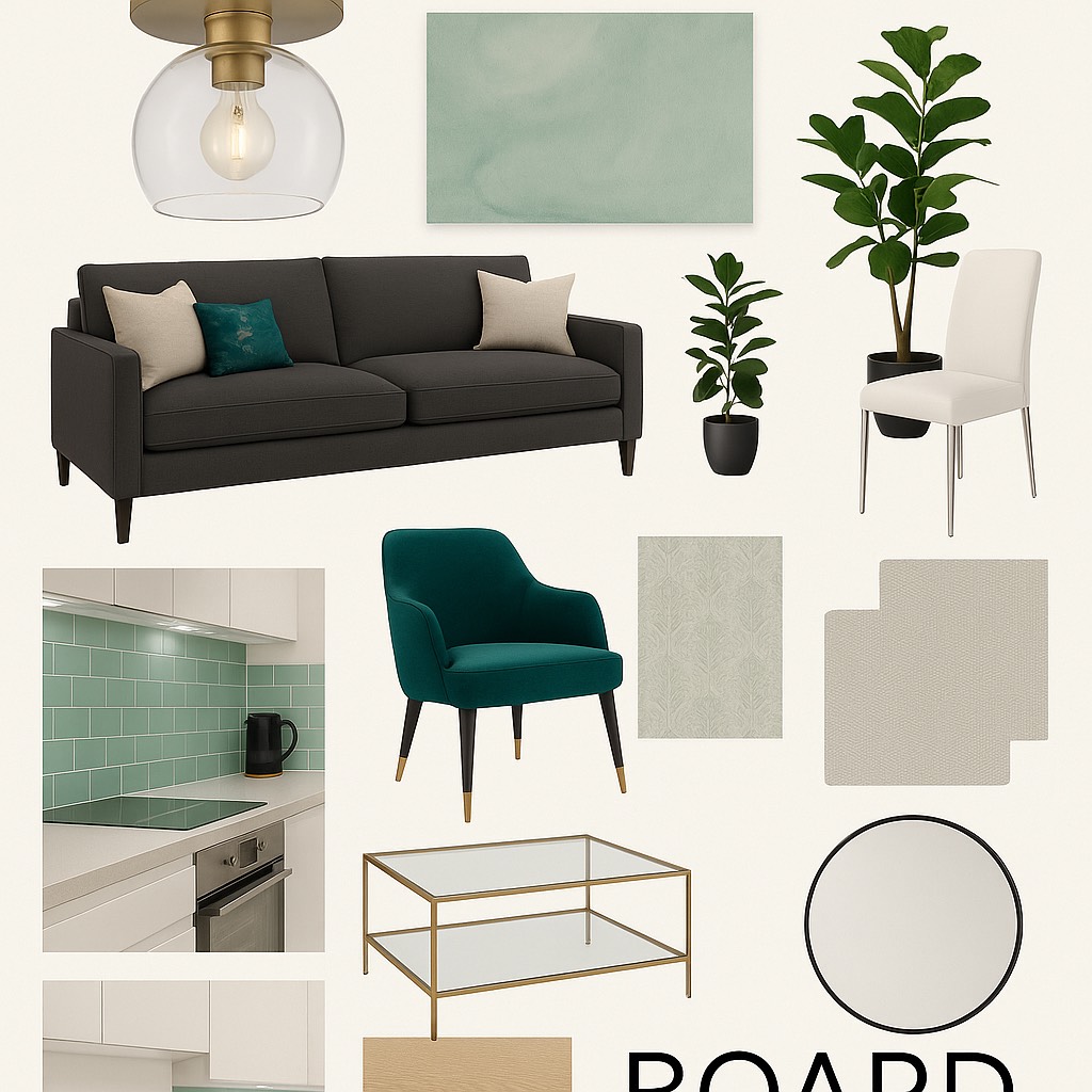 Nestled along the banks of the Thames, this elegant riverside flat is a study in modern luxury with a tranquil edge. Designed to maximize light and serenity, the interior palette flows with soft greens, warm neutrals, and rich accents, echoing the natural tones outside. From the tailored charcoal sofa to the detailed botanical textiles and sleek brass accents, each piece was chosen to bring harmony and quiet sophistication into every corner of the home.